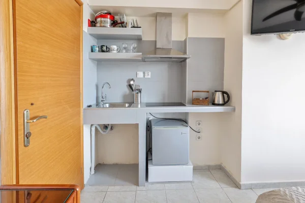 Each deluxe studio features a double bed or two twin beds, a bathroom with shower, and a kitchenette equipped with everything you need for a comfortable stay.